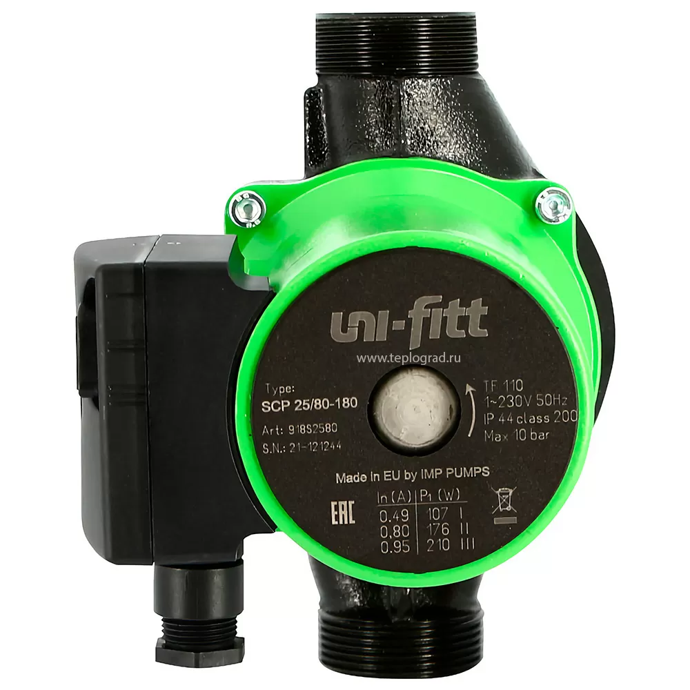 Циркуляционный насос Uni-fitt SCP 25/40 180 с гайками. Используется для создания принудительной циркуляции теплоносителя в различных системах отопления, теплый полах, контуре отопления котла, кондиционирования. Монтажная длина 180 мм.