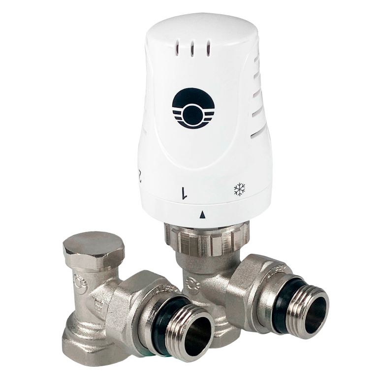 Комплект терморегулирующей угловой Valfex 1/2. Набор предназначен для бокового подключения прибора водяного отопления, автоматического регулирования расхода теплоносителя через него в зависимости от температуры воздуха в помещении, гидравлической балансировки системы отопления. Клапаны выполнены из качественной сантехнической латуни с гальваническим покрытием и оснащены самоуплотняющимися полусгонами. Колпачок ручной регулировки на термостатическом клапане состоит из двух частей – неподвижной нижней и вращающейся верхней. Это позволяет многократно производить монтажную настройку клапана в условиях строительства (до установки термостатической головки), не переживая за целостность резьбы на пластиковом колпачке.