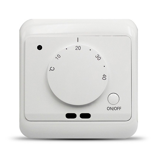 Регулировка температуры осуществляется с помощью поворотной рукоятки. Термостат поддерживает два режима работы: контроль по встроенному датчику воздуха или по выносному датчику теплого пола. Выбор режима производится переключателем, расположенным под лицевой панелью. Предусмотрена светодиодная индикация состояния: красный цвет сигнализирует о процессе нагрева, зеленый — о режиме ожидания. Включение и выключение питания производится отдельной кнопкой на корпусе.