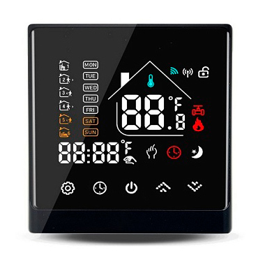 Прибор оснащен цветным дисплеем и встроенным модулем Wi-Fi, что позволяет контролировать климат как с панели устройства, так и удаленно через мобильное приложение Smart Life. Терморегулятор поддерживает работу по встроенному датчику воздуха и выносному датчику пола. Программное обеспечение позволяет настроить недельный график с шестью температурными периодами в течение суток, а также активировать режимы «Ручной», «Нагрев» или «Защита от замерзания».