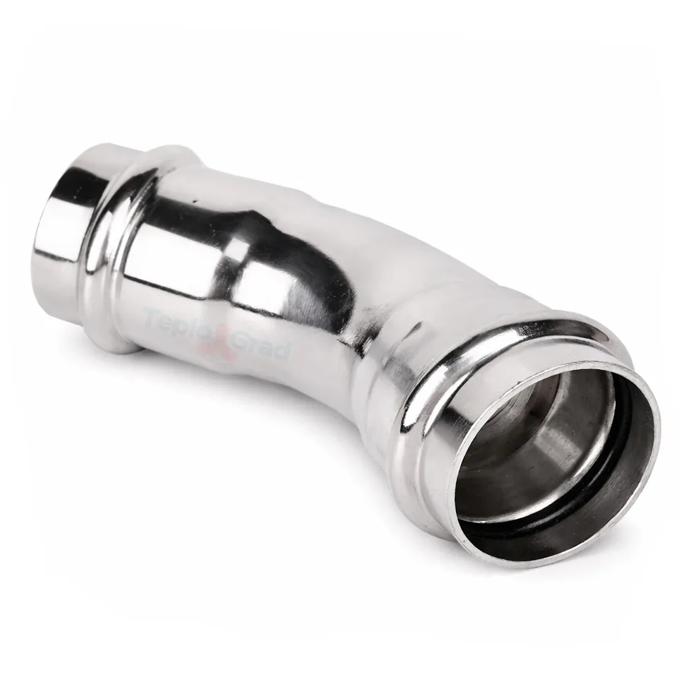 Пресс-угольник двухраструбный 45° 15 TIM из нержавеющей стали. Высококачественный пресс-фитинг из нержавеющей стали с уплотнением из EPDM для 100% герметичности. Соединение – бесштуцерное, обжатие производится с помощью пресс-инструмента V-профиля.