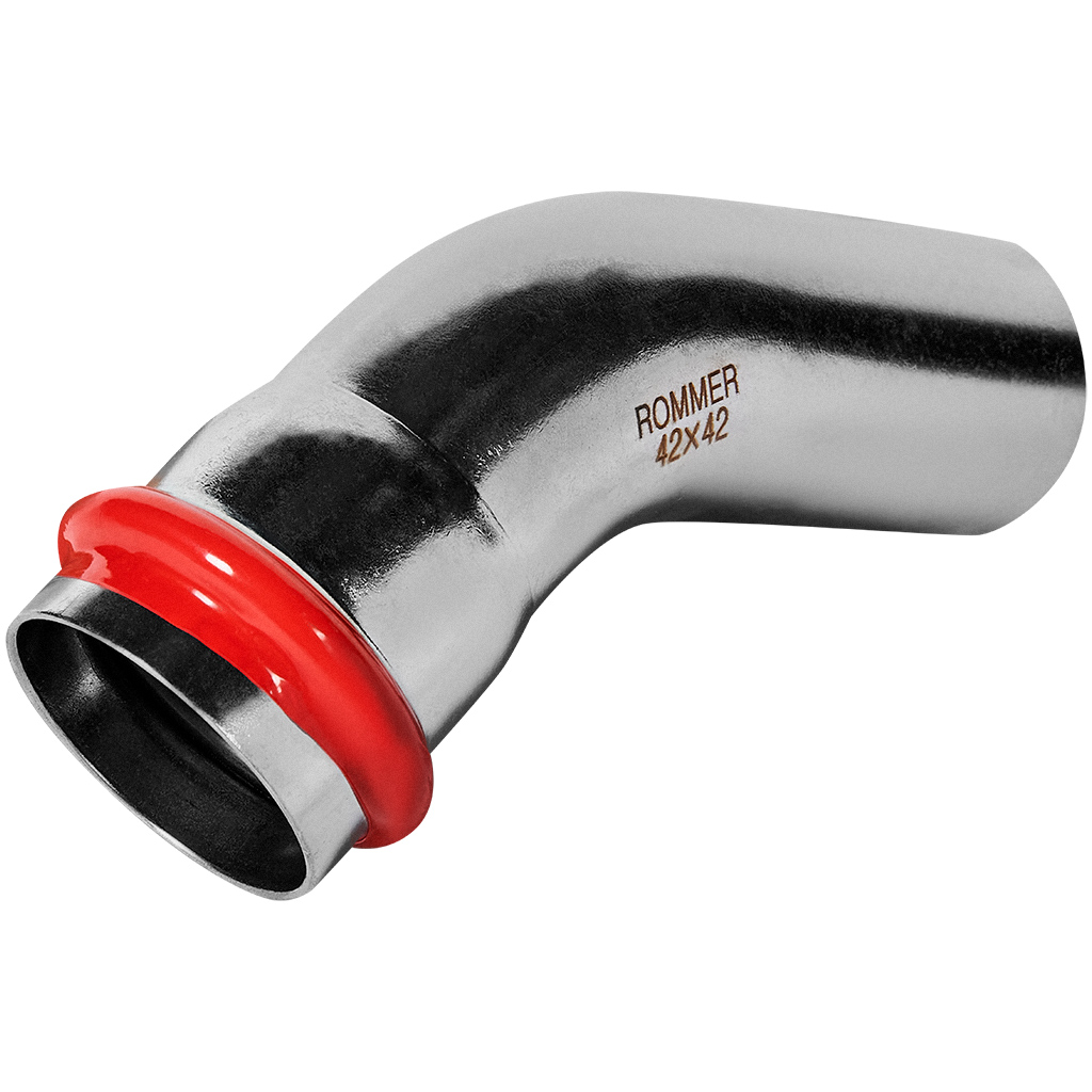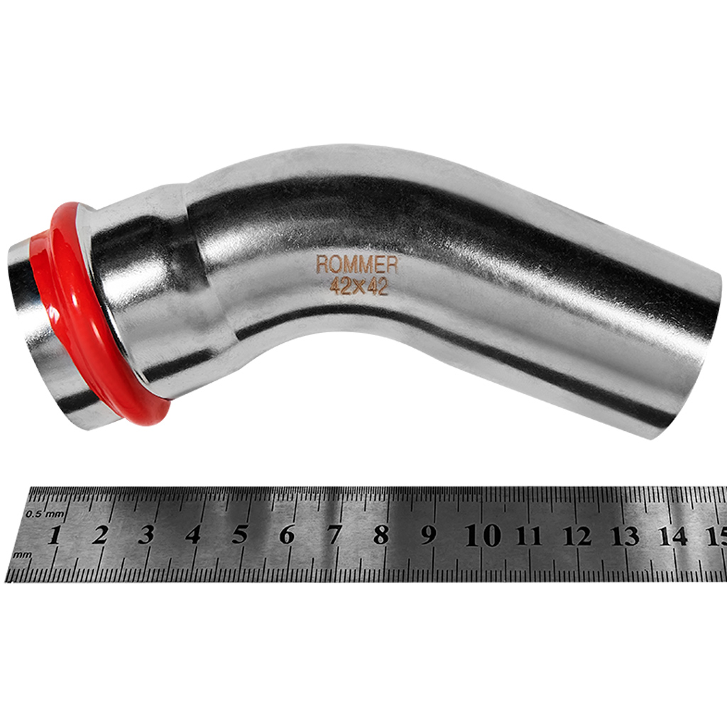 Угольник однораструбный 45° 42 Rommer из нержавеющей стали прессовой. Обеспечивает надежное и герметичное соединение труб. Изготовлен из высококачественной нержавеющей стали SU304, а толщина стенок составляет 1,5 мм. Для прессования фитинга применяется профиль V-образной насадки инструмента, что обеспечивает качественное соединение элементов трубопровода.