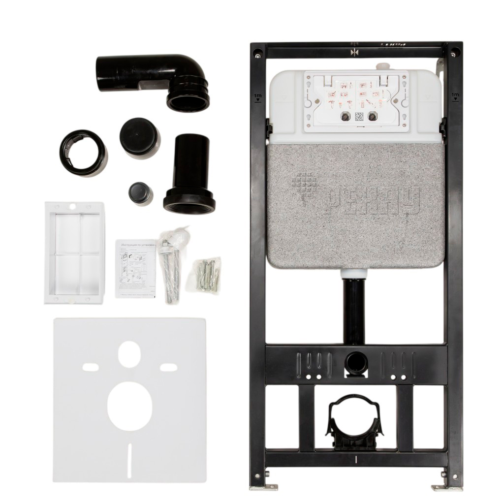 Усиленная рама с порошковым антикоррозийным покрытием рассчитана на нагрузку до 600 кг. Цельновыдувной бачок объемом 7,5 л исключает протечки по швам и поддерживает двойной смыв с заводскими настройками 6/4 л и возможностью регулировки в диапазонах 4,5–7,5 л и 3,0–5 л. Специальная конструкция заливного клапана обеспечивает уровень шума всего 20 дБА, а повторный смыв возможен без ожидания наполнения. Подключение воды выполняется сверху или сзади бачка, минимальное расстояние от стены 135 мм.