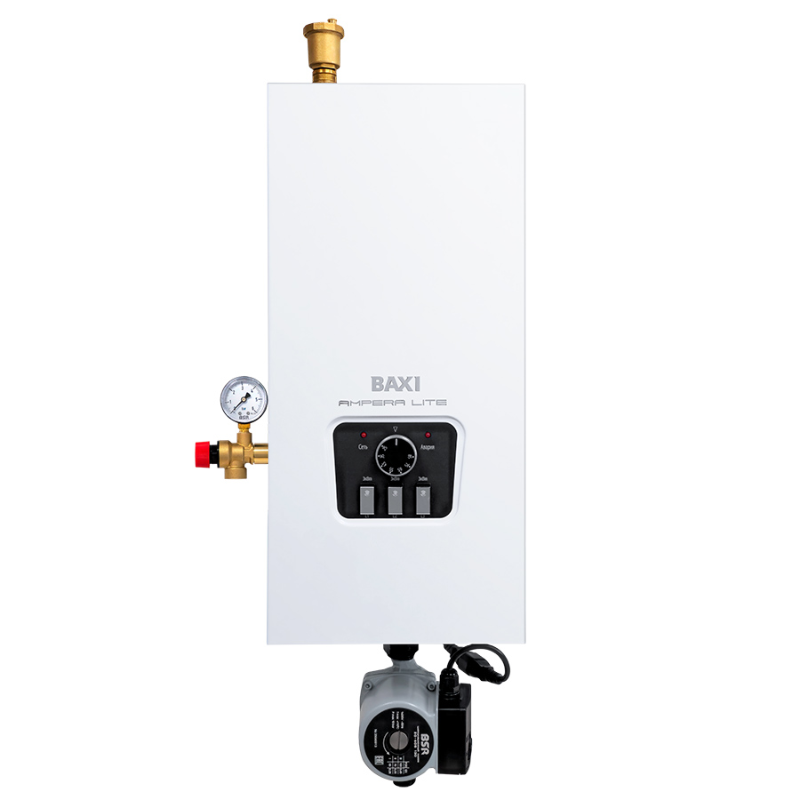 Электрический котел BAXI Ampera Lite 9 предназначен для использования в качестве основного или резервного источника отопления. Модель оснащена встроенным циркуляционным насосом и группой безопасности, образуя полноценную мини-котельную. Поддерживается как однофазное, так и трехфазное подключение. Котел позволяет выбирать мощность вручную по ступеням, имеет контакт для внешнего управления и совместим с комнатным термостатом.