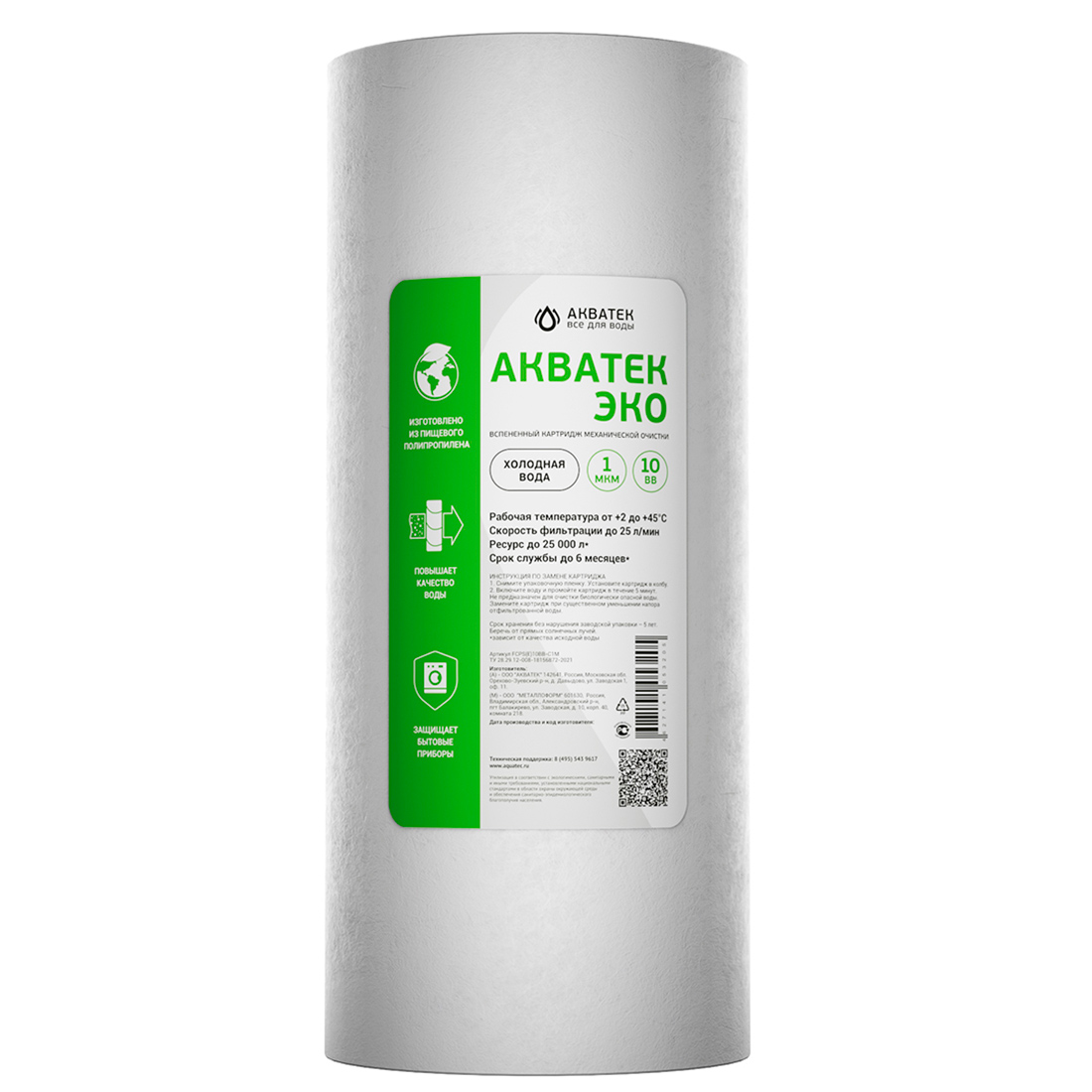 Картридж из вспененного полипропилена Акватек ЭКО 10 ВВ 5мкм. предназначен для предварительной очистки воды от песка, грязи и ржавчины.