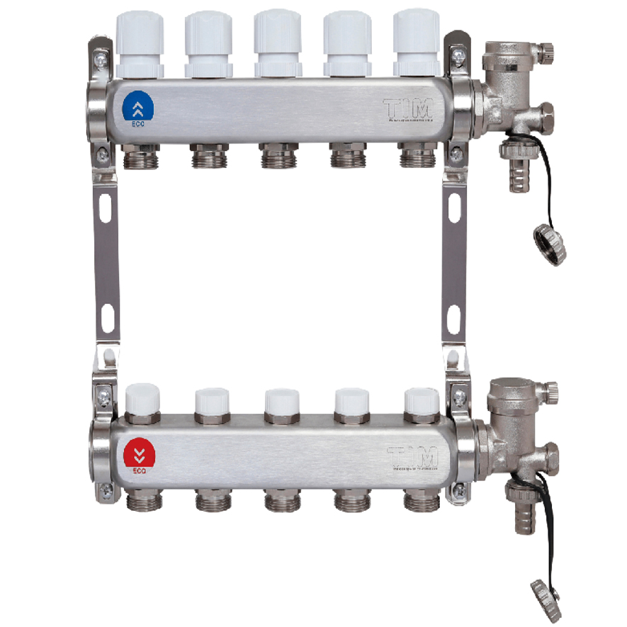 Коллектор без расходомеров TIM на 6 выходов из нержавеющей стали (ECO) применяется в лучевых (коллекторных) схемах для подключения отопительных приборов.