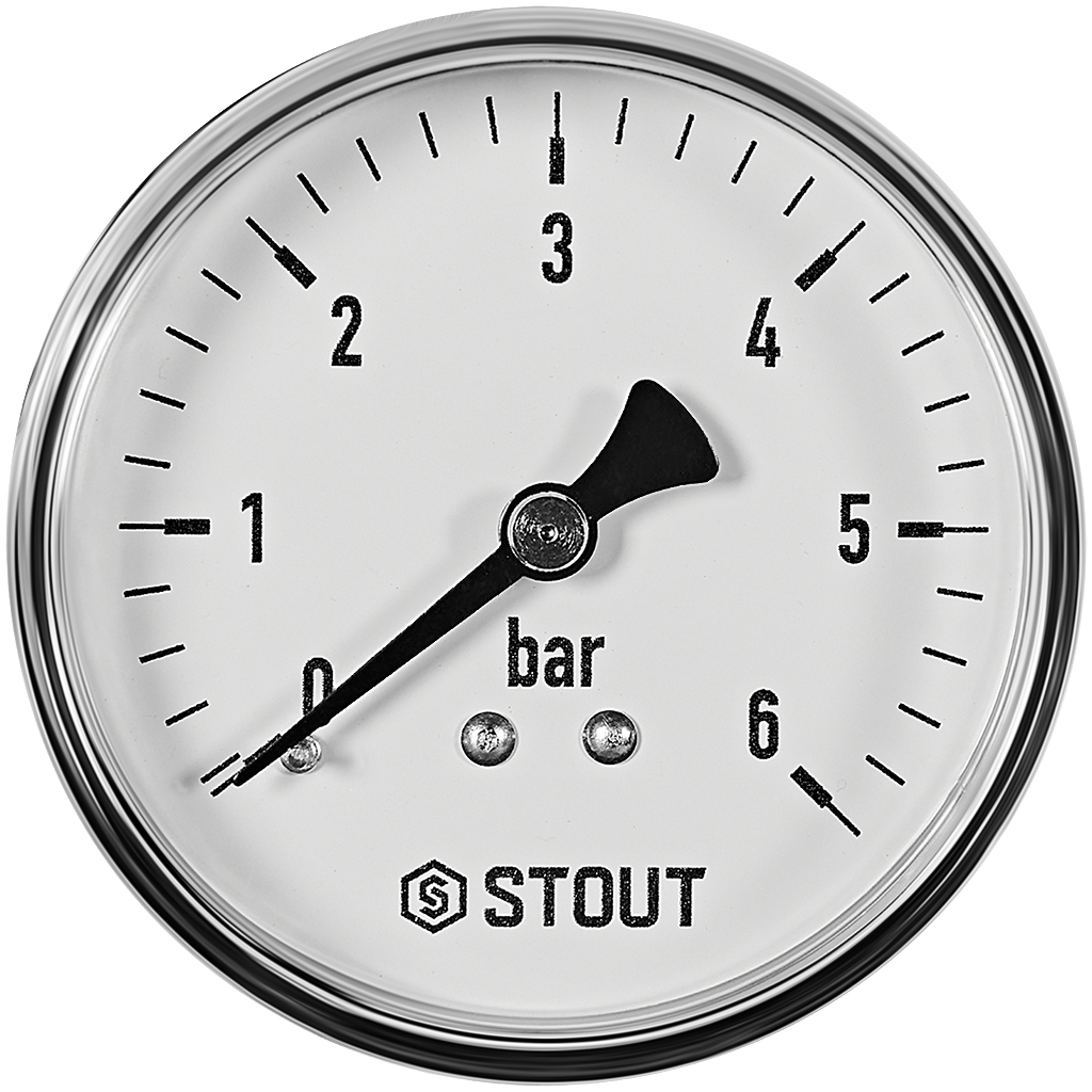 Манометр аксиальный Stout 0-6 бар, диаметр корпуса 63 мм, подключение 1/4" трубная резьба используется для измерения давления в системах отопления и водоснабжения.
