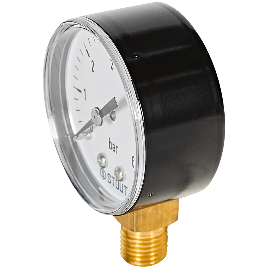 Манометр радиальный Stout 0-6 бар, диаметр корпуса 50 мм, подключение 1/4" трубная резьба используется для измерения давления в системах отопления и водоснабжения.