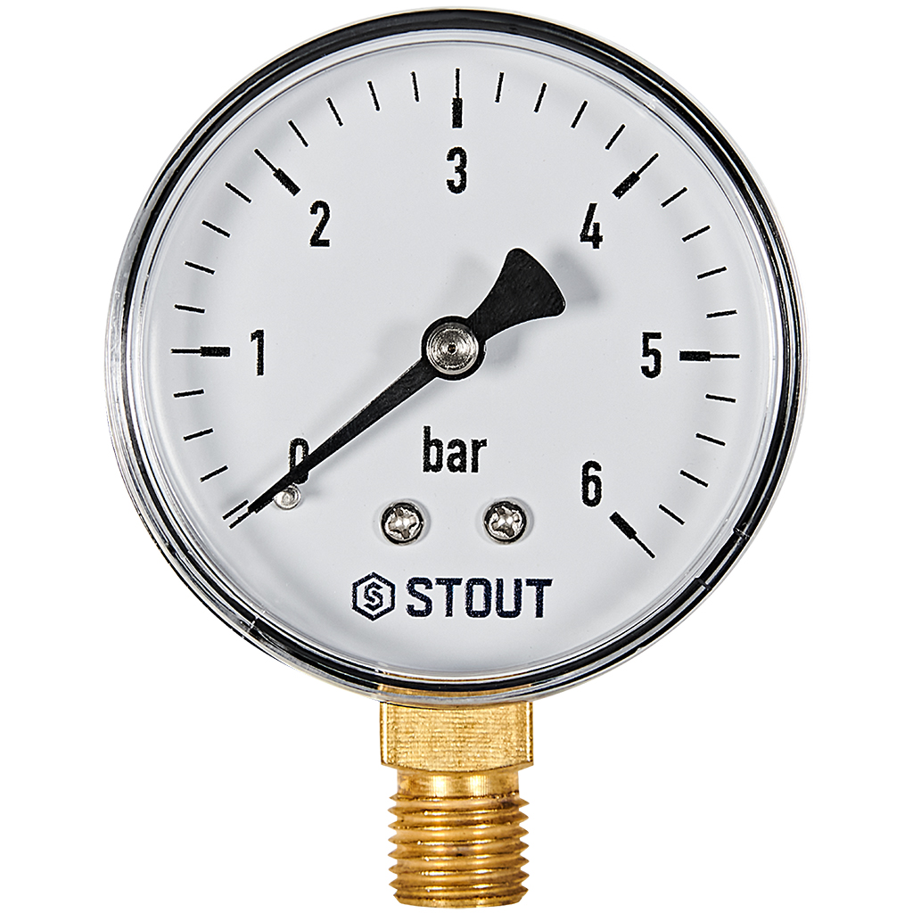 Манометр радиальный Stout 0-6 бар, диаметр корпуса 63 мм, подключение 1/4" трубная резьба используется для измерения давления в системах отопления и водоснабжения.