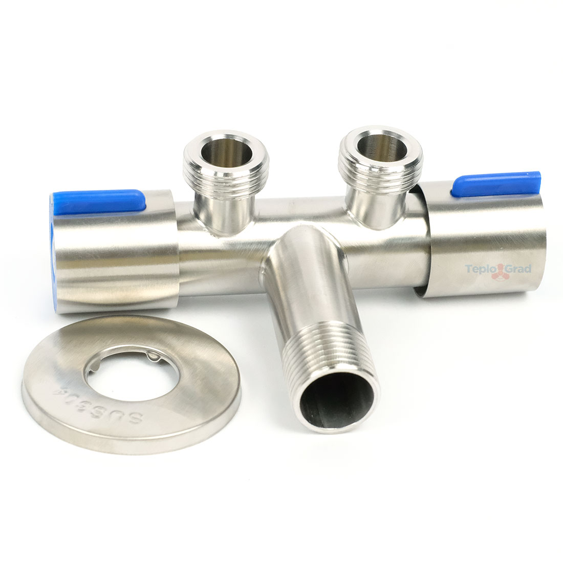 Кран угловой TIM 2 выхода 1/2" предназначен для подключения сразу двух сантехнических приборов и установки под раковиной или в ограниченном пространстве. Конструкция с одним входом и двумя выходами обеспечивает удобную организацию разводки воды. Корпус и шар выполнены из нержавеющей стали, что защищает кран от коррозии. Керамическая букса обеспечивает плавное управление потоком воды, а угловая форма упрощает монтаж и экономит место.