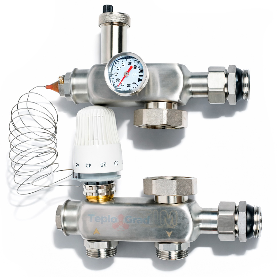 Насосно-смесительный узел TIM JH-1040S для теплого пола представляет собой комплект арматуры из нержавеющей стали, предназначенный для циркуляции и регулирования температуры теплоносителя в системах низкотемпературного отопления. Узел поставляется без циркуляционного насоса и подходит для монтажа с насосами длиной 130–180 мм. Конструкция обеспечивает стабилизацию температуры вторичного контура теплого пола, включает термостатический клапан с термоголовкой, датчик температуры и байпас с регулируемой пропускной способностью.